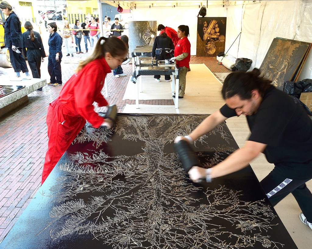 An open exhibition, where large-format woodcut processes are accessible to the public at the University of the Andes (Bogota, Colombia) in 2020. Directed by Carmen Rodríguez, professor of engraving at the Faculty, who uses the annual project as an answer to the question: How do we bring engraving to the streets?