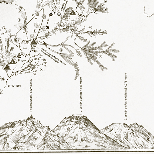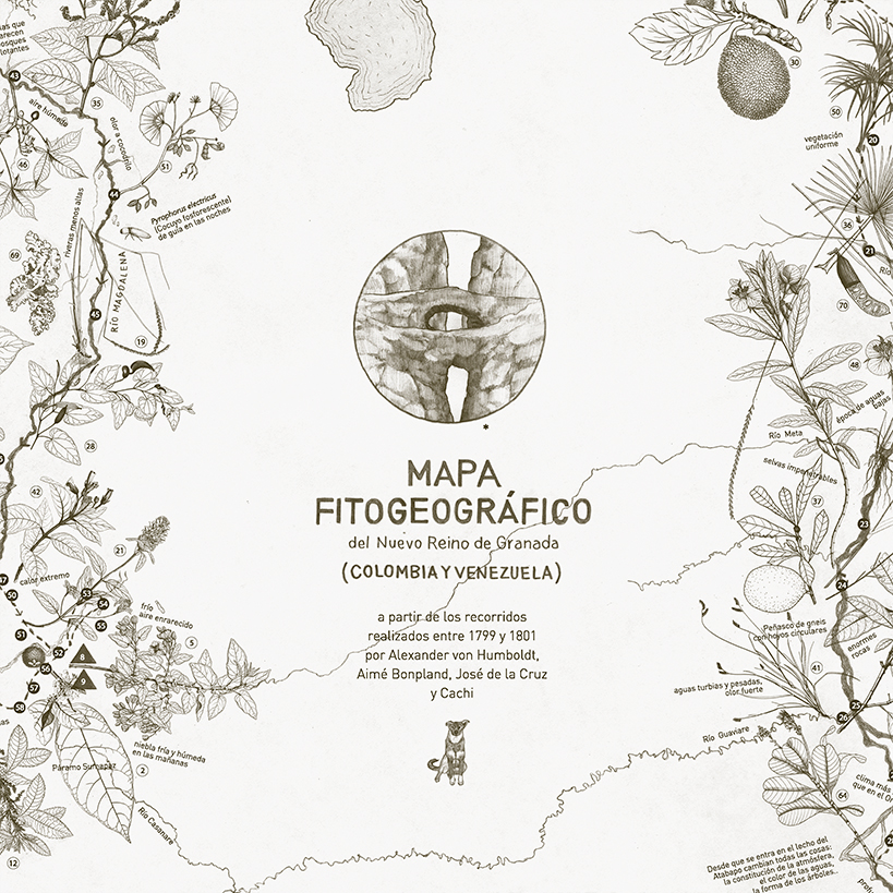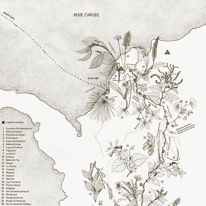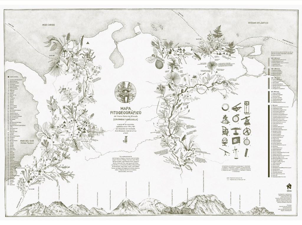 Ilustración de los recorridos realizados entre 1799 y 1801 por Alexander von Humboldt, Aimé Bonpland, José de la Cruz y Cachi por los territorios hoy en día conocidos como Colombia y Venezuela. Incluye el trayecto, plantas recolectadas, montañas medidas e instrumentos utilizados durante la expedición.
